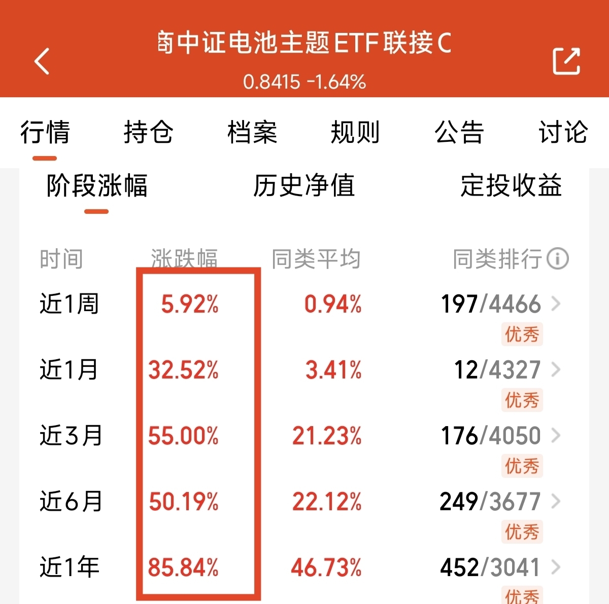 $招商中证电池主题ETF联接C$ 这只跟踪中证电池指数指数基金,全面覆盖了电池上下游产业链,对比其他电池类指数。固态电池跟储能电池的含比更高,所以说今年来的表现一直不错。近一个月上涨了32.52%。近3月涨幅55%。涨幅同类电池基金的五倍还多。近一年涨幅达到了85.84%,稳定大幅跑赢了同类平均业绩!今天估值大涨了3.85%,还是比传统的电池要强很多。从长期来看,经过前期三年的调整,电池板块估值低。性价比高。未来的成长空间大。我也是看好未来的成长表现。准备开始布局了。
