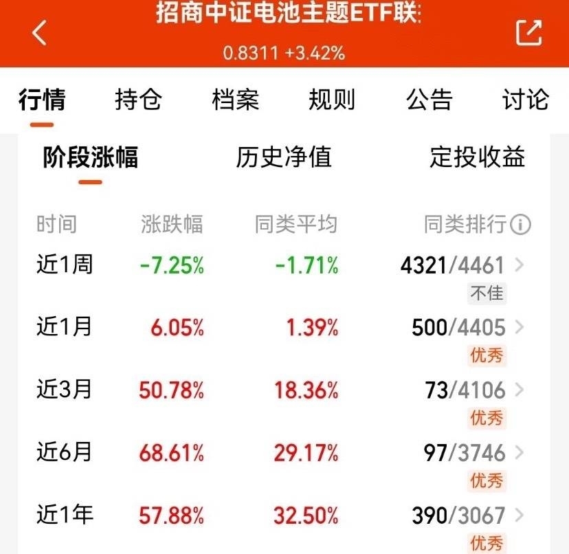 昨天电池板块表现不错,我的$招商中证电池主题ETF联接C$ 基金涨了3.42%,今天还在继续涨,目前预估又涨了0.80%。电池ETF相关板块也很强势,最近连续9天都有资金流入,规模增加了60多亿。像阳光电源、当升科技这些龙头股都涨得挺好。