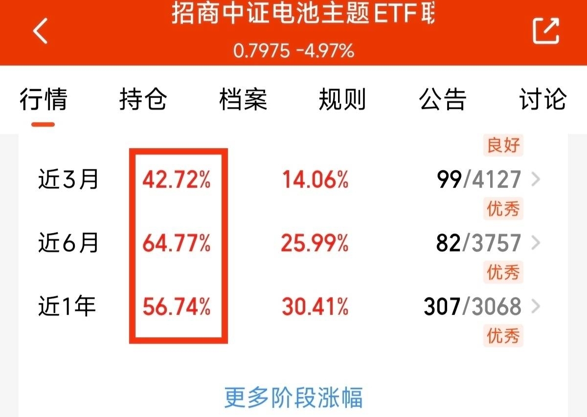 $招商中证电池主题ETF联接C$ 这只跟踪中证电池指数指数基金,全面覆盖了电池上下游产业链,而且对比其他电池类指数。固态电池跟储能电池的含比更高,本轮行情来,主要还是固态电池跟储存电池也是更强,所以基金表现的非常不错。即使经过本轮回调,近3月依然上涨了42.72%。涨幅是同类电池基金平均业绩的三倍还多。近半年上涨了64.77%。稳定的超额收益能力强,今天估值涨幅达到了3.5%。目前来看,电池板块新一轮上涨已经启动。我也顺势布局。