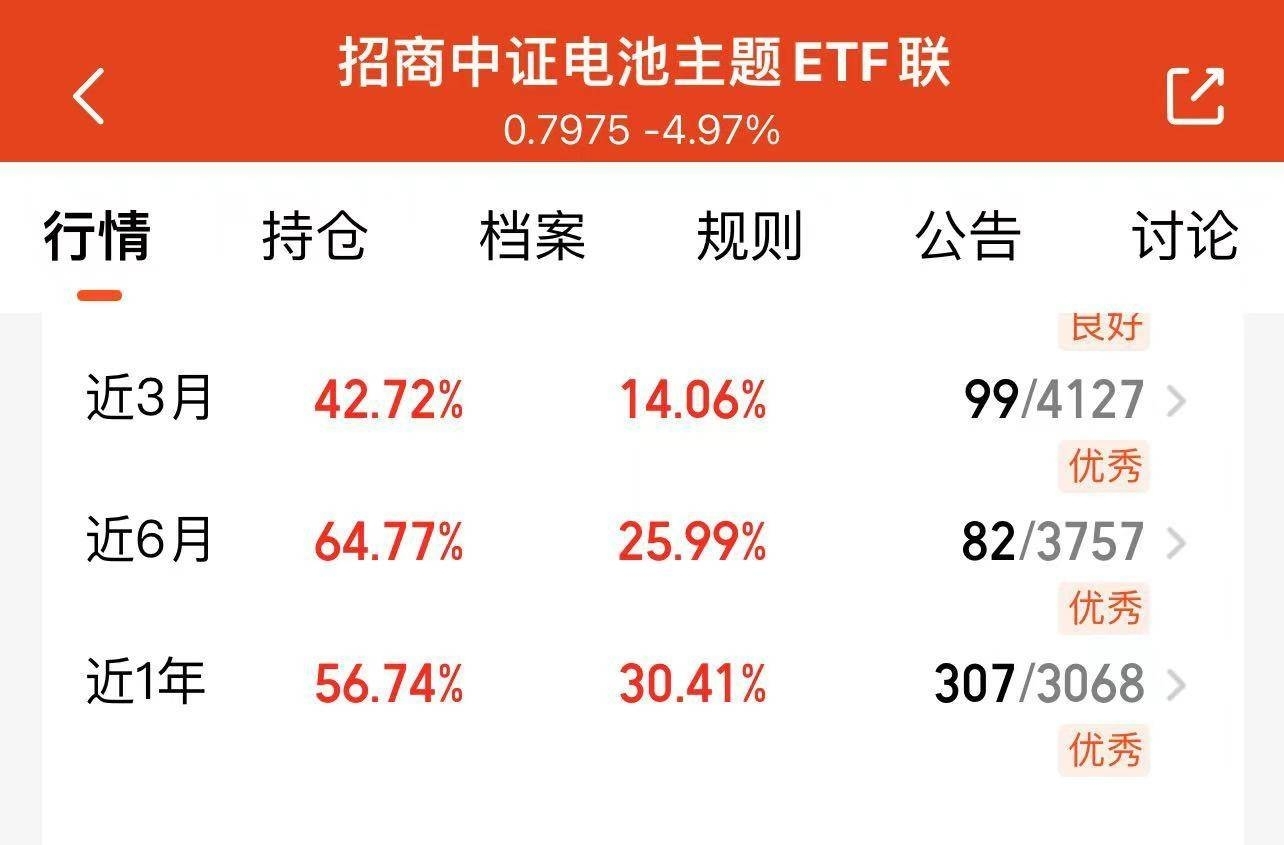 我关注的$招商中证电池主题ETF联接C$ 这只基金,主要投资电池产业链的上下游企业。和其他同类基金相比,它在固态电池和储能电池方面的配置更多,这轮行情中表现特别突出。虽然市场有波动,但这只基金近三个月还是涨了42.72%,比同类平均高出三倍多。近半年涨幅达到64.77%,今天预估又涨了3.5%左右。从目前情况看,电池板块可能又要开始新一轮上涨了,所以我也跟着做了些布局。