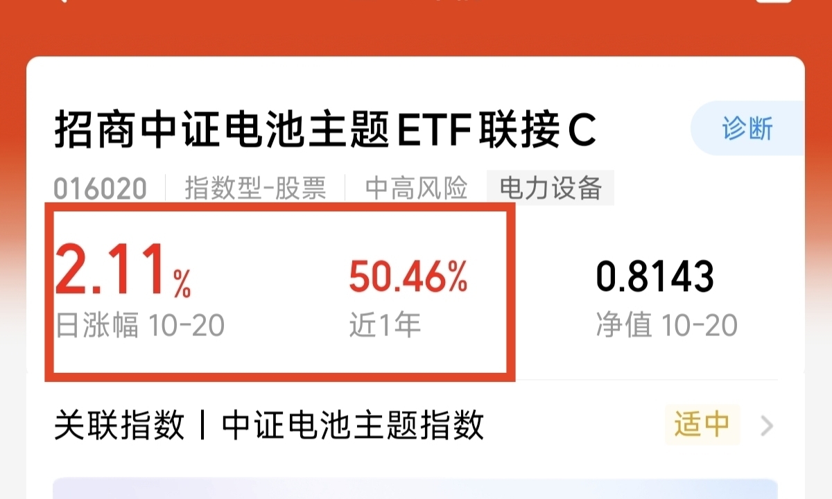 $招商中证电池主题ETF联接C$ 这只跟踪中证电池指数指数基金,全面覆盖了电池上下游产业链,而且对比其他电池类指数。固态电池跟储能电池的含比更高,昨天上涨了2.11%。同类电池基金再次做到了领先。而且,本轮行情来,主要还是固态电池跟储存电池也是更强,即使经过本轮回调,近3月依然上涨了45.2%。涨幅是同类电池基金平均业绩的三倍还多。近半年上涨了67.31%。稳定的超额收益能力强,目前来看,电池板块新一轮上涨已经启动,我坚定看好四季度电池板块的成长表现。