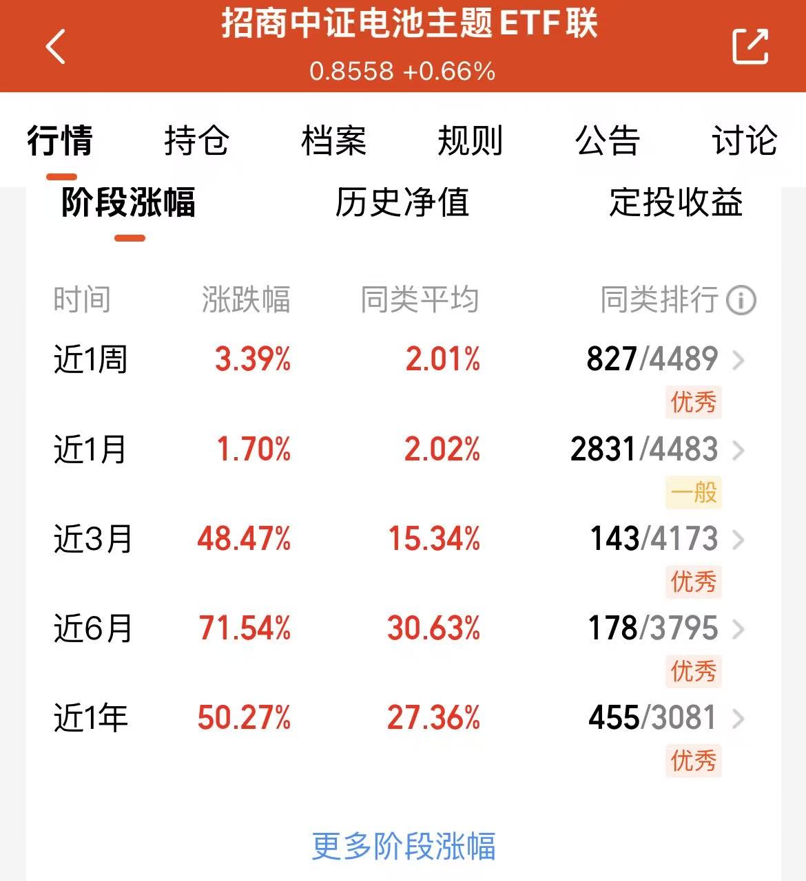 今天A股继续反弹了,三大指数高开高走,不过板块也是有所分化,电池赛道今天反弹哟,$招商中证电池主题ETF联接C(OTCFUND|016020)$估值上涨3.05%,昨天上涨0.66%,近六个月涨幅71.54%,业绩优秀,持仓覆盖宁德时代、亿纬锂能等核心产业,据数据来看,前三季度宁德时代同比增9.28%呢,亿纬锂能也都实现两位数增强,再加上固态电池的发展也越来越快了,储能需求也在不断的增加,电池方向有可能成为未来的主线,所以我是继续看好这个赛道的!
