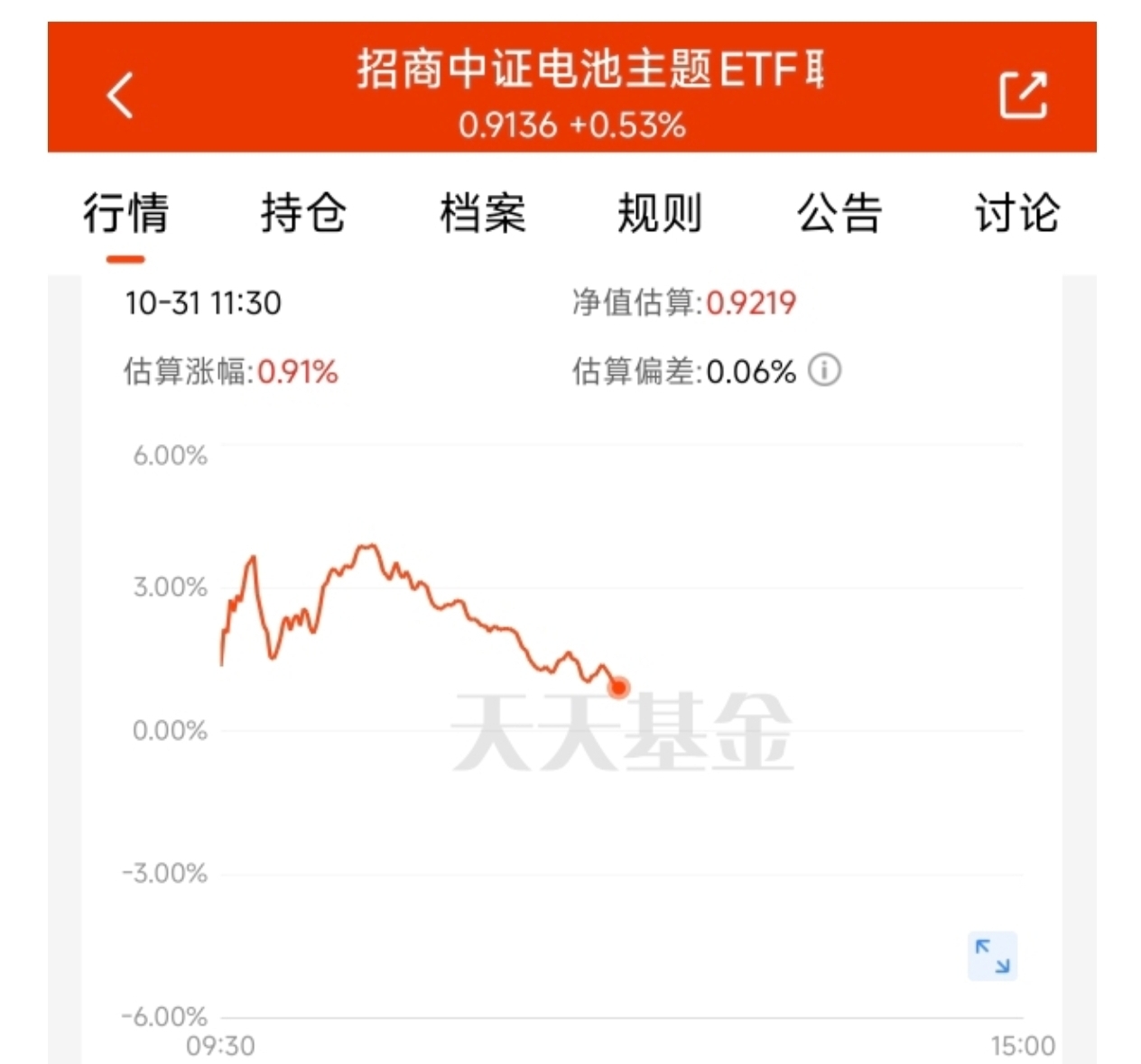 我持有的招商中证电池主题ETF联接C这两天连续上涨,昨天涨了0.57%,今天又涨了0.91%。看看近半年的表现,涨幅已经超过80%了,这个走势确实让人意外。之前没怎么关注,现在倒是有点后悔没早点布局。