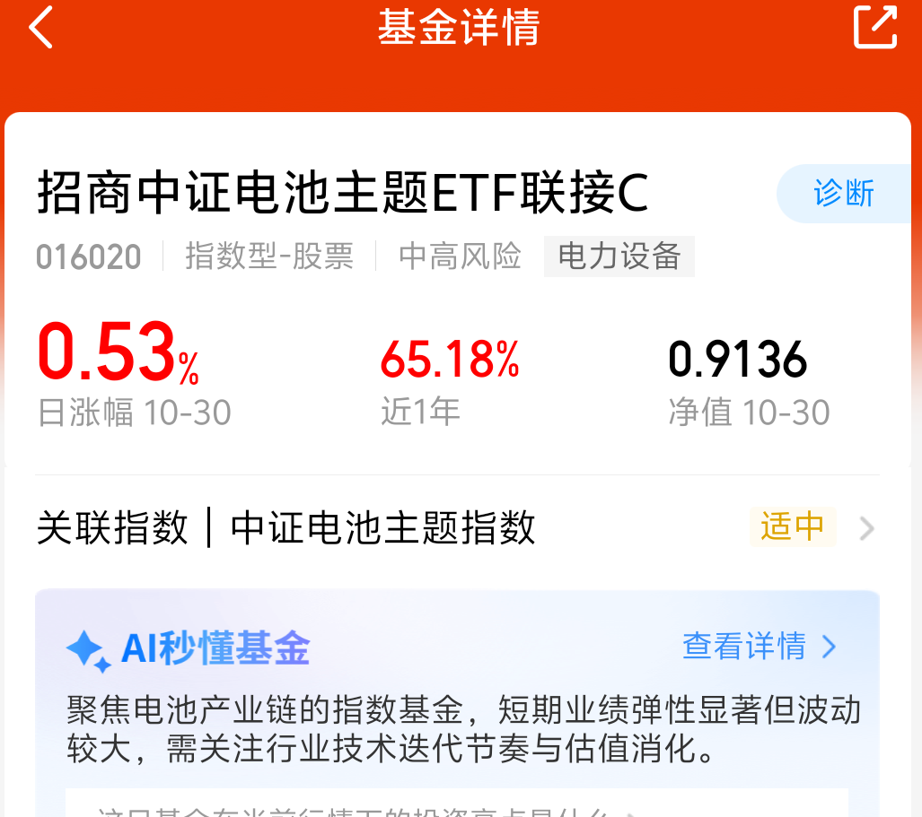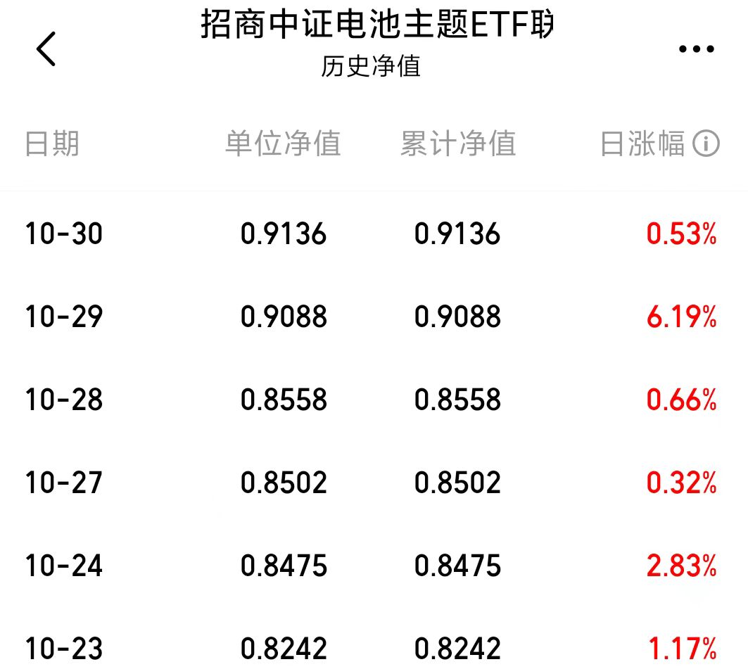 我关注的$招商中证电池主题ETF联接C$ 016020已经连续6个交易日收红,这个基近3个月上涨了61.73%,近6个月上涨了81.92%,不管是短期还是长期表现都非常的不错,我还是比较看好其后市的!