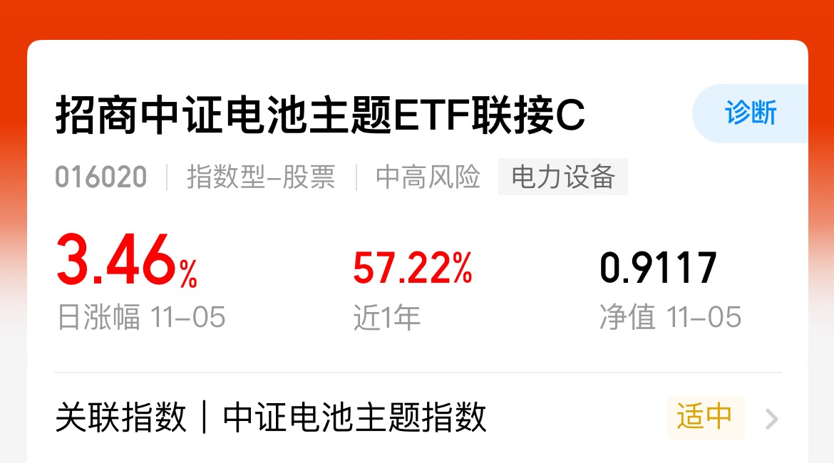 近期市场资金聚焦储能赛道相关概念,持续活跃,从海外储能大单落地,到国内政策催化,储能产业链成为新能源领域的核心热点$招商中证电池主题ETF联接C$ 这只基金紧密跟踪国证电池指数,全面覆盖储能产业链,关键环节,关键是业绩做的也不错,我长期看好电池爆发的行情还在后面