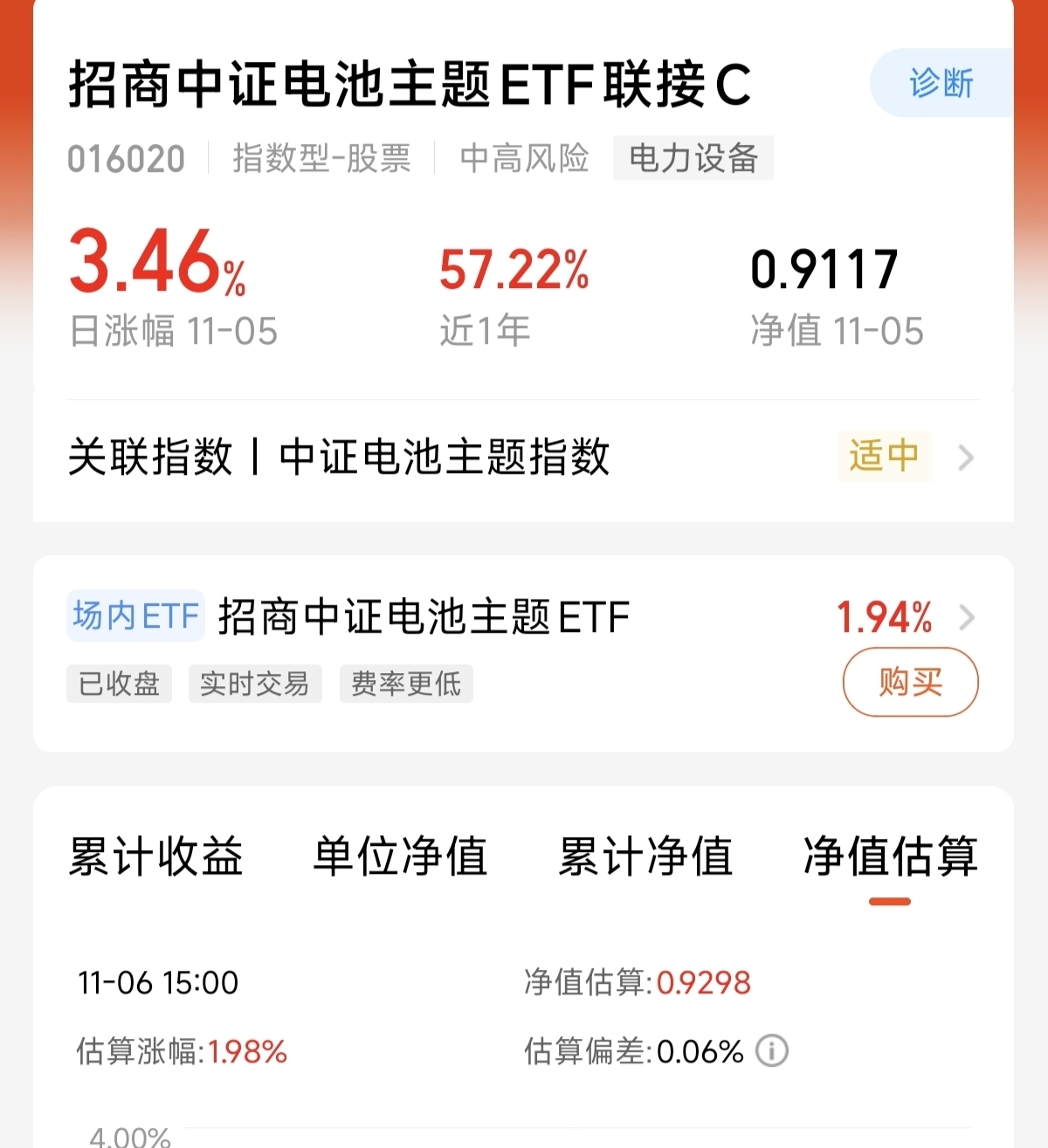 $招商中证电池主题ETF联接C$ 这次聚焦电池主题的指数基金。紧跟中证电池指数,指数中固态电池跟储能电池的含比更高。所以说本轮的表现也是更强。昨天上涨了3.46%。今天估值又上涨1.98%。不得不说爆发力也是真的强。我坚定看好未来的稳定收益表。