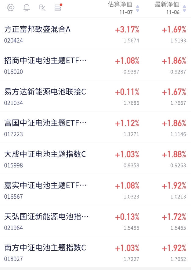 $方正富邦致盛混合A$ 今天预计涨了3.17%,实力在线的,可以过来看看呀$招商中证电池主题ETF联接C$ 今天预计涨了1.08%,继续关注的