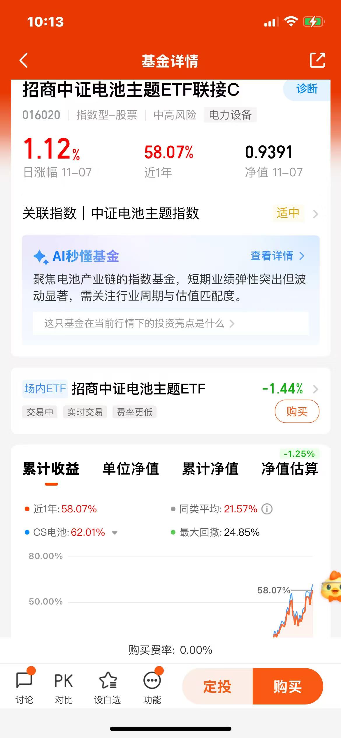 上周电池板块表现不错$招商中证电池主题ETF联接C(OTCFUND|016020)$上周上涨1.12%,连续三大的大涨,该基金净值又突新高,近半年上涨82.88%,整体趋势走的很漂亮 。
