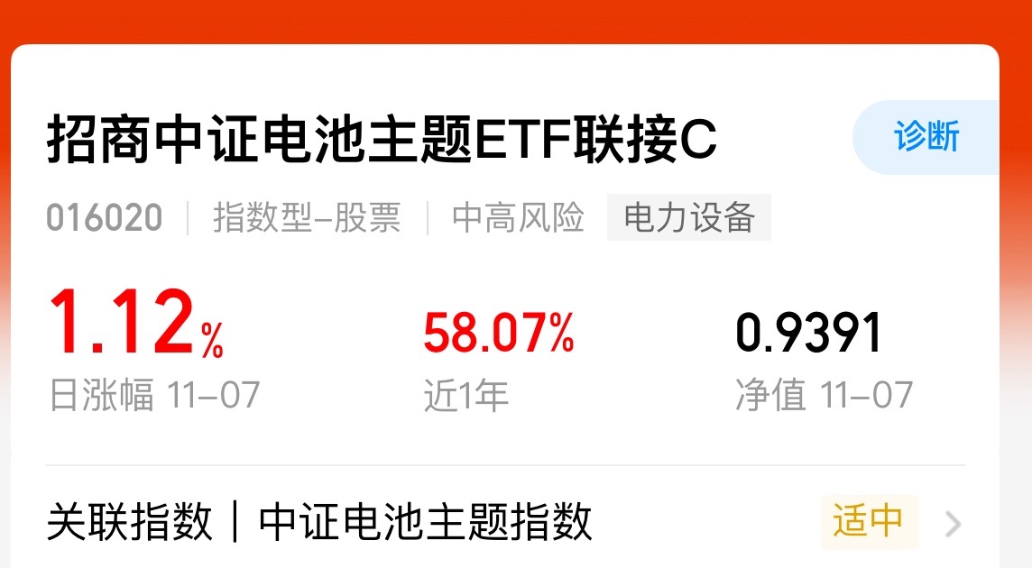 今天市场调整,前面很火的科技今天回调了,但是固态电池一直在上涨,延续了上周的走势,继续+1比我看好的$招商中证电池主题ETF联接C$ ,最近涨幅还不错,再加上有各种利好催化,后面行情还是值得期待的