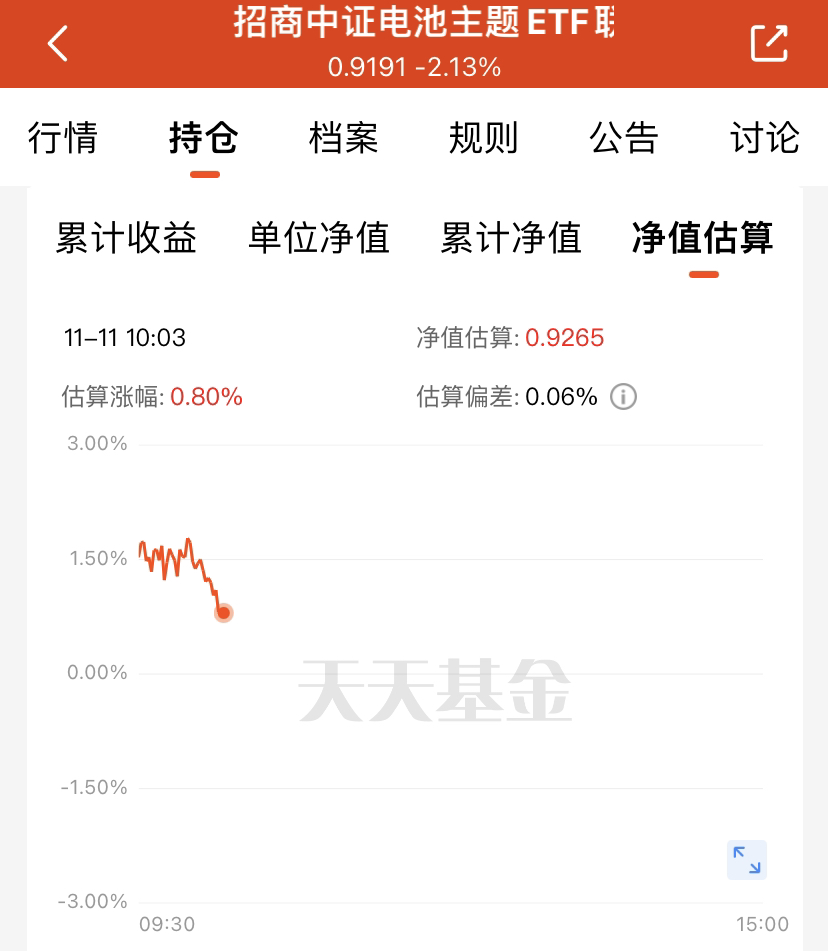 今日开盘时,大家还是很开心得,比较强势得板块有所表现,但是随着大盘得回落,部分板块也开始回落。$招商中证电池主题ETF联接C(OTCFUND|016020)$现在估值上涨0.8%,从一年维度来看,锂电板块当前估值并未高估,行业明年预计仍能保持25%-30%的增长,所以我之前加仓,也充满了期待。