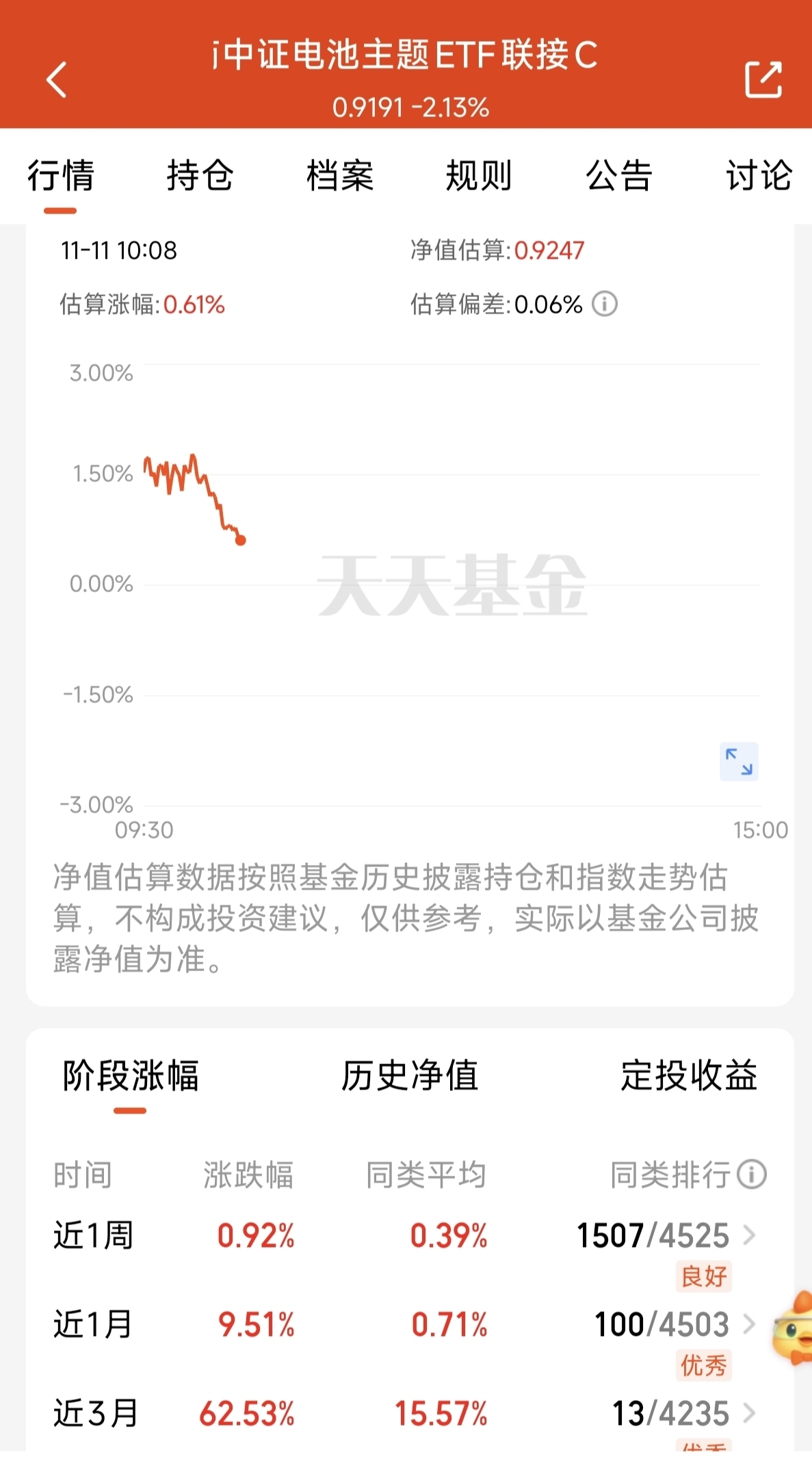 $招商中证电池主题ETF联接C$ 这只聚焦电池产业的指数基金。跟中证电池指数,指数中固态电池跟储能电池的含比对比其他指数也是更高。所以在本轮行情中表现也是更强的。近一个月上涨了9.51%。近3月上涨了62.53%。是同类平均业绩的三倍还多。也是当前市场的主线。我看好未来长期的成长表现。