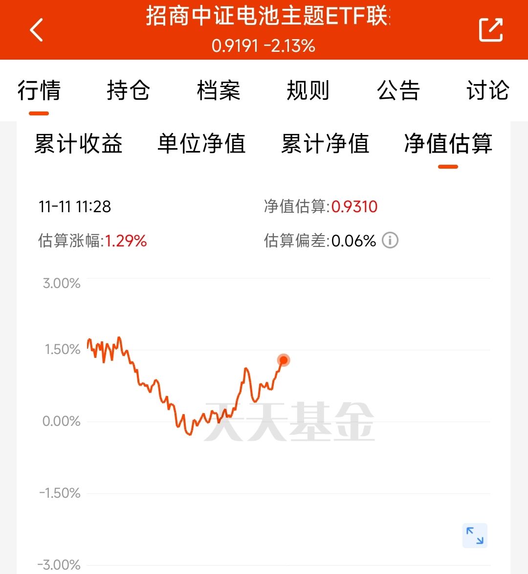 早盘个股涨多跌少,但量能萎缩,主动买盘不足,反弹没劲儿。不过电池板块挺强势,今天领涨 ,新主线算走出来了。我仍看好这个方向,$招商中证电池主题ETF联接C(OTCFUND|016020)$基金跟踪板块龙头,近 6月涨 77.26%,跑赢同类型基金,很不错哦!有消息刺激,还被大资金当作科技调整后的接替赛道,后续有望继续反弹。