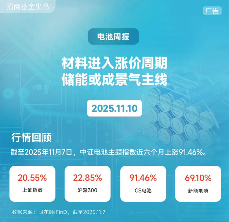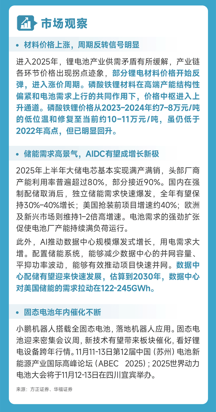 方正证券:全球储能需求共振上行、带动电芯厂满负荷排产,2025Q1-Q3中国储能电池出货已超2024年全年三成,储能行情持续火热、成为电池板块最强景气主线。