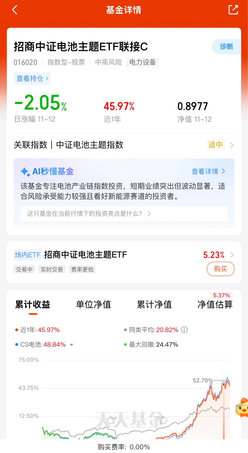 今日电池板块高开高走,单日大涨近6%,展现强劲爆发力。$招商中证电池主题ETF联接C$ 净值随之大幅攀升。