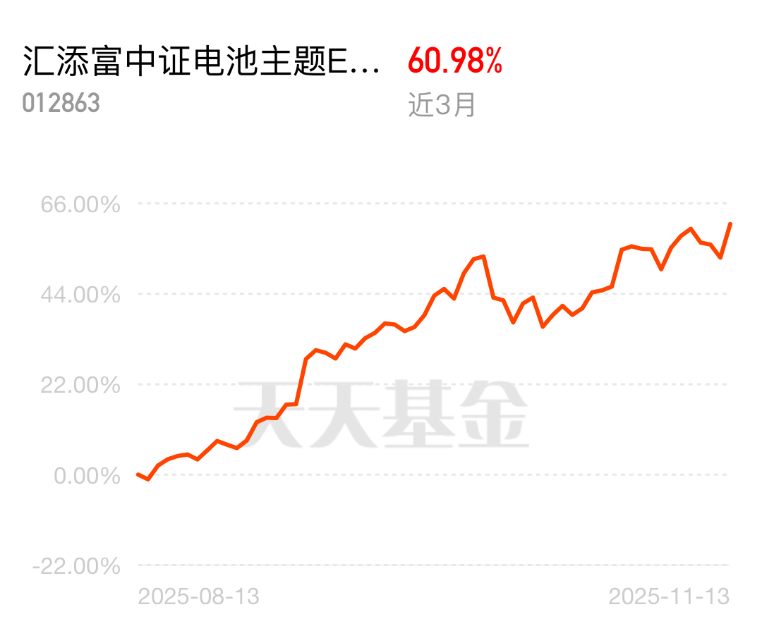全球能源转型是大趋势,电池需求越来越旺,不管是电动车还是储能领域都在放量。汇添富中证电池主题ETF联接C踩准了这个风口,近3个月涨幅达到60.98%,覆盖锂矿、锂电池等优质赛道,普通投资者也能轻松参与这波上涨。$汇添富中证电池主题ETF发起式联接C$