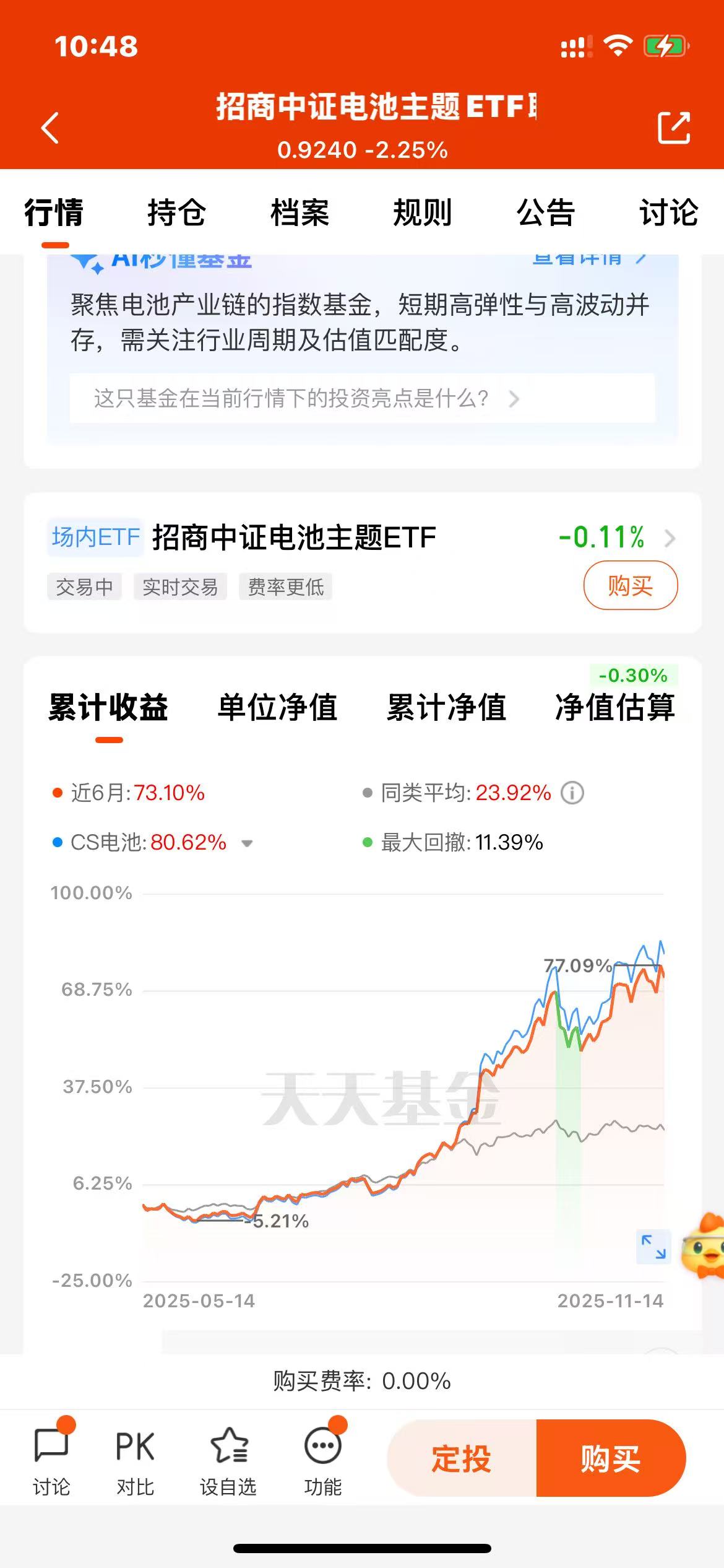 近半年来$招商中证电池主题ETF联接C(OTCFUND|016020)$涨幅高达73.10%,如果回调的话也是很正常的,近一周就回调了一些。