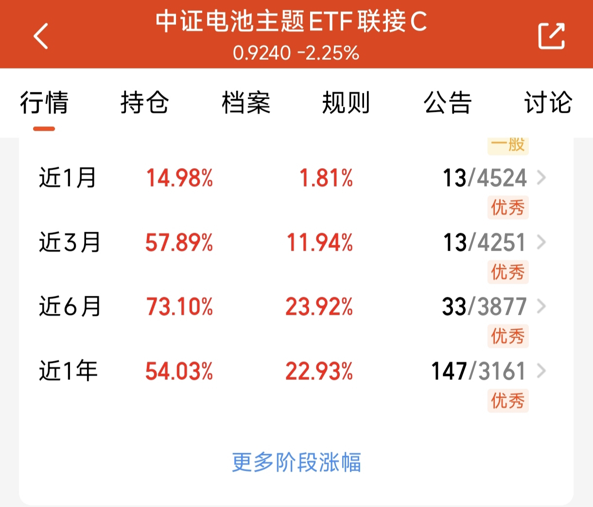 $招商中证电池主题ETF联接C$ 今天小幅震荡,不过近三个月涨了57.89%,近六个月涨了73.1%,真的太牛了