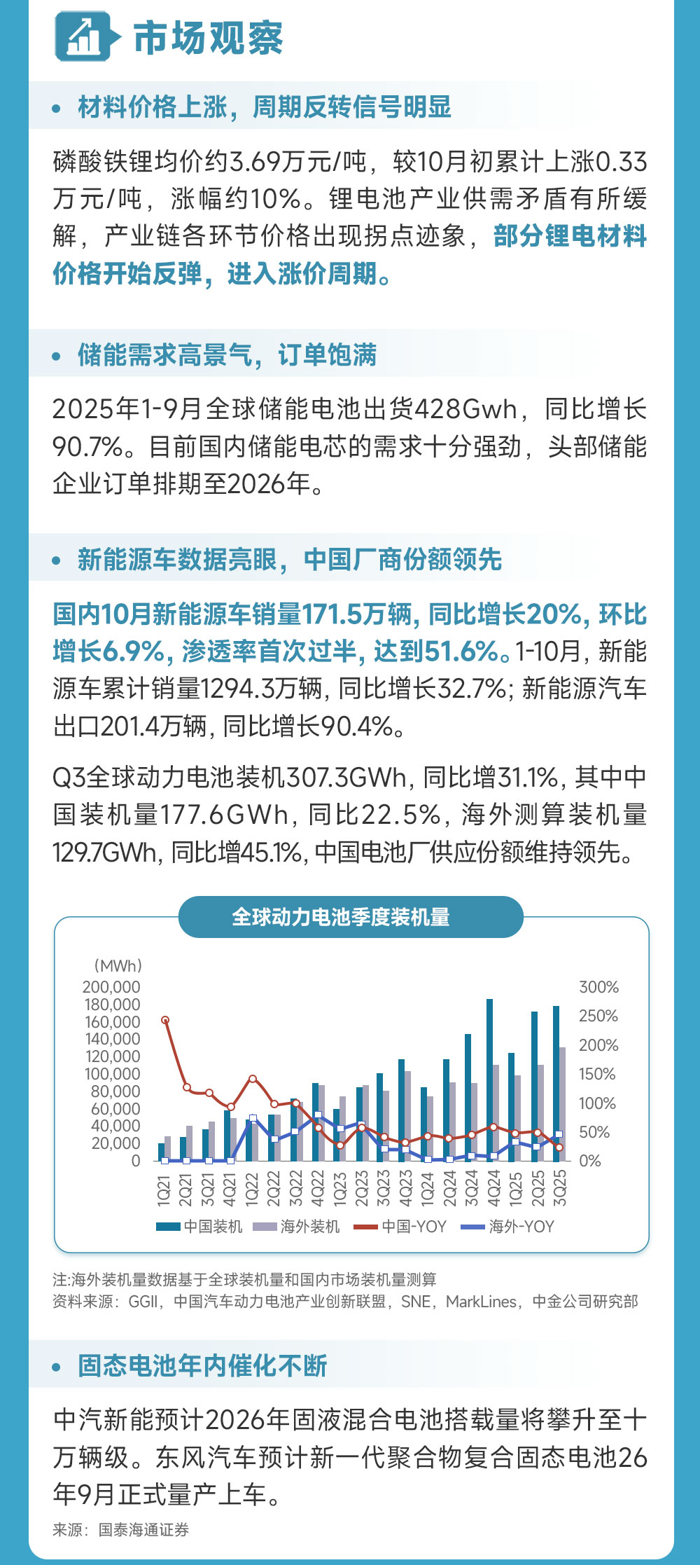 东吴证券:电池供不应求,11月排产进一步提升0-5%,明年一季度淡季不淡,预计环比仅个位数下降,其中,储能需求超预期,价格已上涨3-5分/w,材料方面,铁锂涨价确定,其余材料26年涨价有望跟进,且中美关税下降、锂电管制延期,继续全面看好锂电池板块。同时材料供需关系好转,预计有不同程度涨价,预计Q4开始盈利明显修复,明年反转,碳酸锂供需也有望反转,同时固态中试线2H25密集落地,继续强推硫化物固态电解质和硫化锂及核心设备。