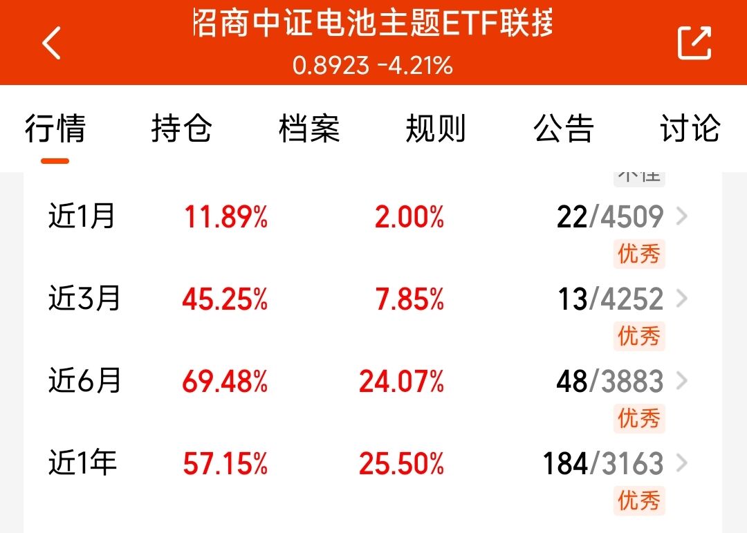 三连阴跌破短期上升趋势线,没想到今天股市低开高走,走出深 V “大长腿” 行情。厦钨新能公告扩产千吨级硫化锂,27 年建成,带动电池板块盘中表现亮眼。$招商中证电池主题ETF联接C(OTCFUND|016020)$业绩能打,近三个月涨 45.25%、近六个月涨 69.48%,我长期看好这个方向,打算分批加仓布局。