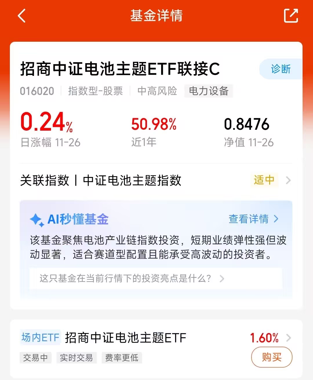电池板块开始反弹,今天场内继续上涨!鹏辉能源、天际股份这些企业都宣布满产满销,宁德时代还签了 200GWh 的十年采购大单,行业利好不断。$招商中证电池主题ETF联接C(OTCFUND|016020)$紧跟电池赛道主线,近三个月涨幅超 33%,能直接吃到技术突破和资金加持的红利。现在行业景气度在线,我果断加仓布局,趁着这波高景气行情,牢牢握住机会~