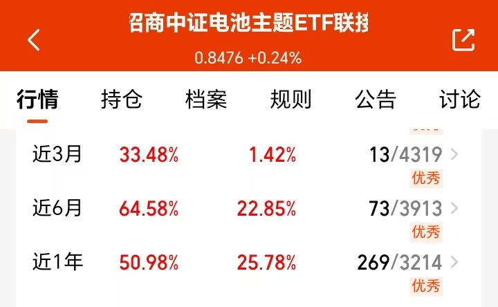 $招商中证电池主题ETF联接C(OTCFUND|016020)$覆盖电池全产业链,近半年涨幅超 60%,总算没白布局,个人觉得当前逢低入手性价比较好,行业景气度和政策扶持都在,后续行情值得期待。