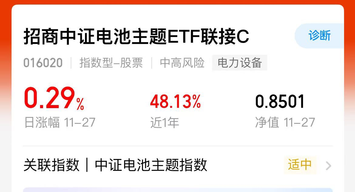 今天行情继续震荡上行,但我感觉反弹的后劲还是挺大的。再加上年底流动性挺紧张的,资金都很谨慎,没有什么太大的进展,而且现在市场热点也在轮动的很快。我觉得还是要找一些比较稳定的$招商中证电池主题ETF联接C$ 这只基金昨天单日上涨0.29%。今天盘中估值又是上涨的。今天又可以吃肉了