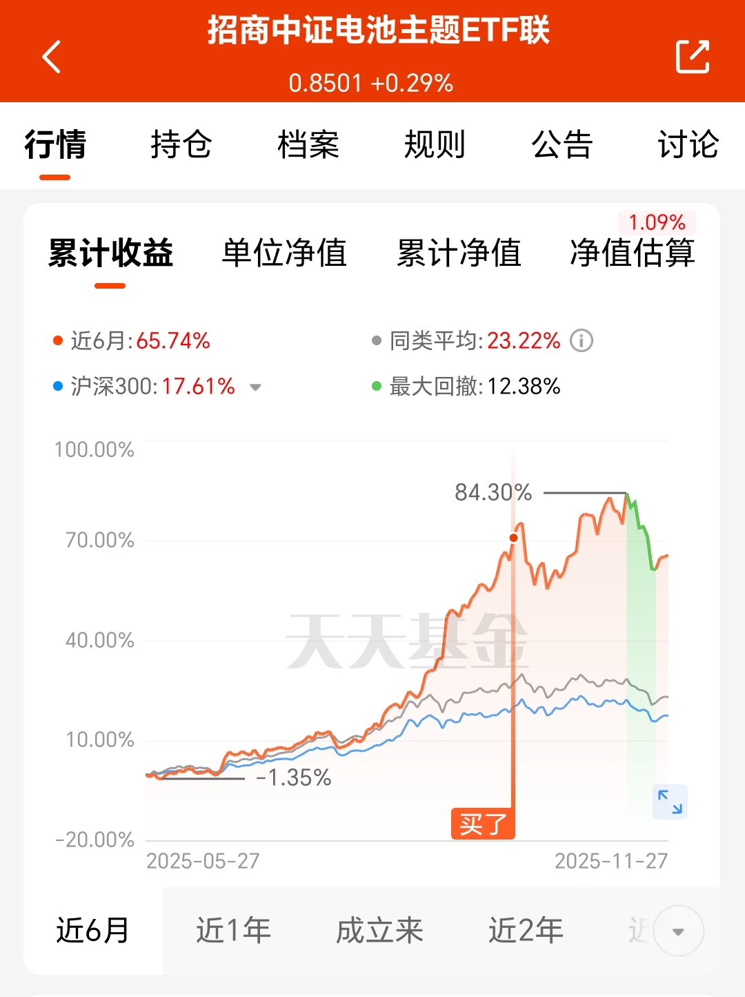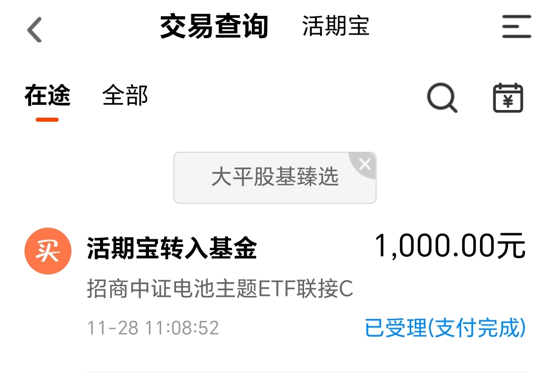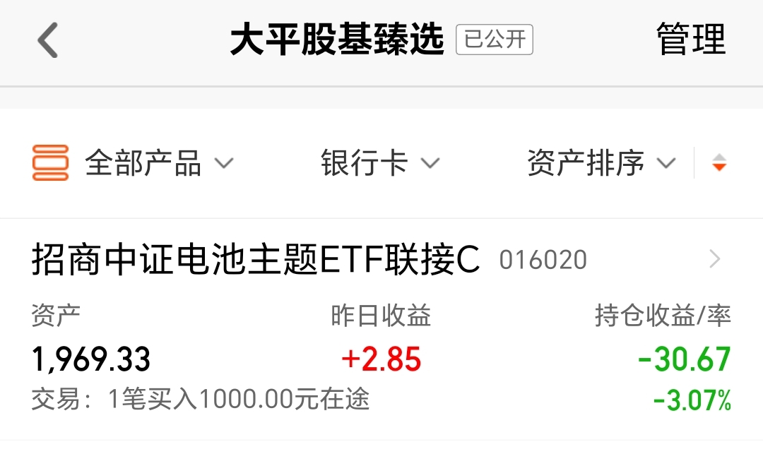 今天我买入$招商中证电池主题ETF联接C(OTCFUND|016020)$1000块钱。