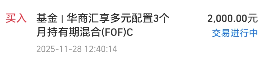 今天我上车$华商汇享多元配置3个月持有混合(FOF)C(OTCFUND|025265)$2000块钱。