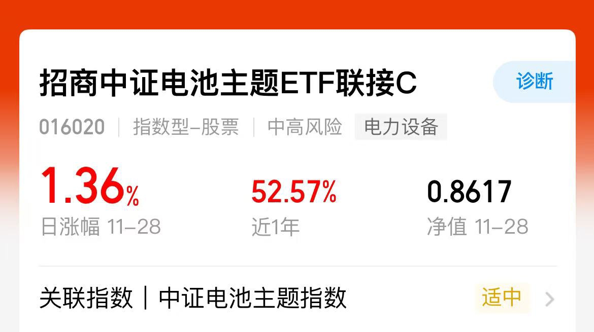 今天a股三大指数继续反弹,市场情绪面越来越稳了,从消息面来看,宁德时代签署了200gwh的10年采购大单。这一个消息直接带动产业链,所以我觉得电池板块近期真的是利好,不断前进,非常值得期待。$招商中证电池主题ETF联接C$ 这只基金聚焦电池产业链,近三个月的涨幅达到34.39%,近半年的涨幅也达到69.43%,在同类排名中也很优秀,继续看好。