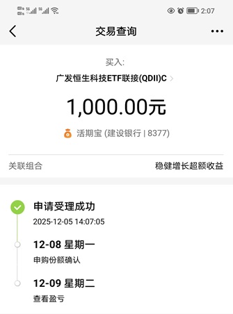 1.恒生科技:我今天继续加仓$广发恒生科技ETF联接(QDII)C(OTCFUND|012805)$1000元,这支基金是恒生科技指数的ETF联接基金。恒生科技指数包含众多的科技互联网以及芯片产业链公司,是中国资产中非常有代表性的科技指数,深受境内外科技投资者喜欢的指数。指数近3年涨44.77%,近2年涨49.36%,近1年涨27.51%,近6月涨7.60%,近3月涨0.66%,近1周涨0.31%,各时间周期都能线性上涨,表现稳定且优秀。从技术面来看,恒重科技从11月21日探底后开始企稳,11月24日开始反弹,随后一路震荡上行到现在。昨天与今天连续走出两根阳线,已经收复了5天10天均线,转强信号明显。展望未来,美下周将有议息会议,若有超预期的降息,那全球资本市场必将有所反应。往后人工智能AI算力持续催化,特别是应用端,预计多模态市场关注度以及后续业绩的提升空间都很大。我坚定看好恒生科技接下来的表现,今天继续加仓本基金。下面我晒一下买入操作记录: