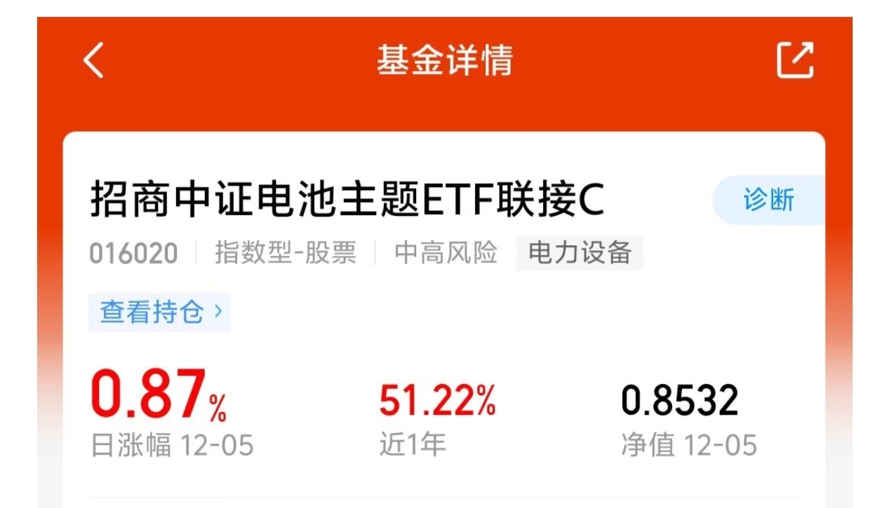 今天市场整体走势不错,尤其是科技和新能源板块比较活跃。我关注的$招商中证电池主题ETF联接C$ (016020)今天预估涨了1.71%,最近半年累计涨幅达到65.51%,表现挺亮眼的。我觉得新能源行业未来发展潜力大,特别是电池领域,会是个长期向好的方向。目前我的持仓里就有这只基金,打算后面找机会再慢慢加点仓。虽然短期可能有波动,但看长远些还是值得持有的。