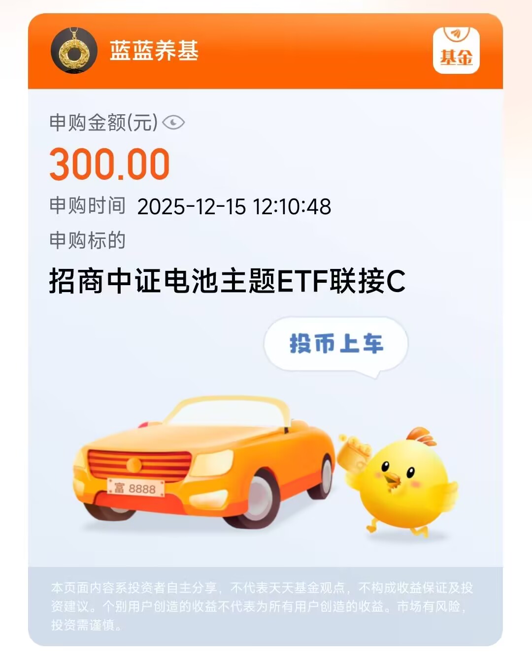 今日 A 股冲高回落,电池赛道有点波动,但长期看国内锂电池产业全球能打。电池级碳酸锂一个月涨 21.9%,直接带动产业链。$招商中证电池主题ETF联接C(OTCFUND|016020)$持仓很给力,固态电池占 40%、储能占 60%,上涨弹性大,近 6 个月涨 62%,业绩跑赢同类。当前电池赛道趋势明确,大概率成未来主线,今日回落,我继续低吸。