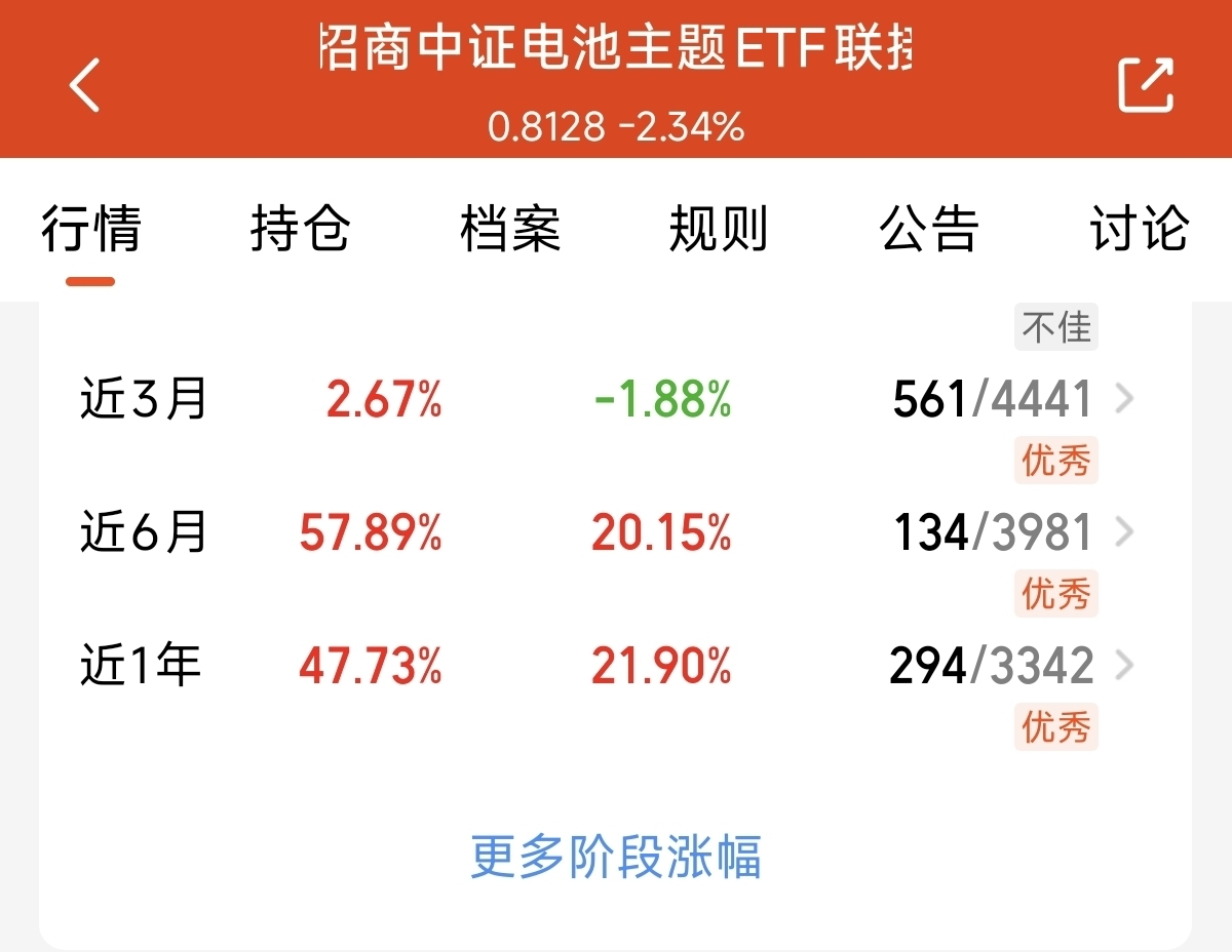 $招商中证电池主题ETF联接C$ 这只聚焦电池产业的指数基金,请跟中证电池指数,指数中固态电池跟储能电池的含比更高。所以说每次上涨起来爆发力也是比较强。目前的估值已经涨超两个点。从长期的业绩表现来看,近半年上涨了57.89%。也是稳定跑赢同类电池基金。我看好滇池赛道长期的成长表现。期待继续创新高。