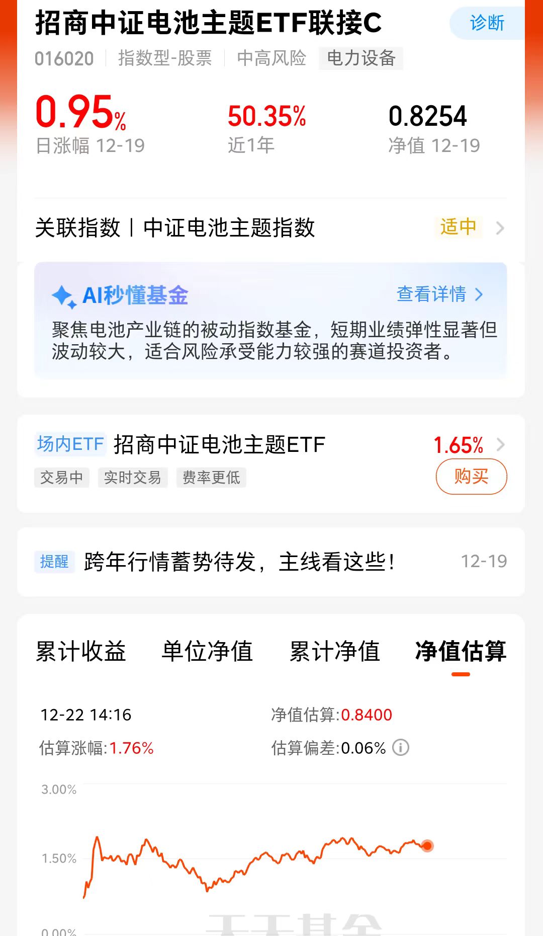 今天股市行情反弹,又见普涨行情,全球储能概念增强,电池板块值得关注,而且从一年维度来看,锂电板块当前估值并未高估。行业明年预计仍能保持25%-30%的增长,仍有向上空间。此外固态电池的落地加速也有望提升板块估值水平,上车我选$招商中证电池主题ETF联接C(OTCFUND|016020)$,上周五上涨0.95%,今天估值又张超1个点。