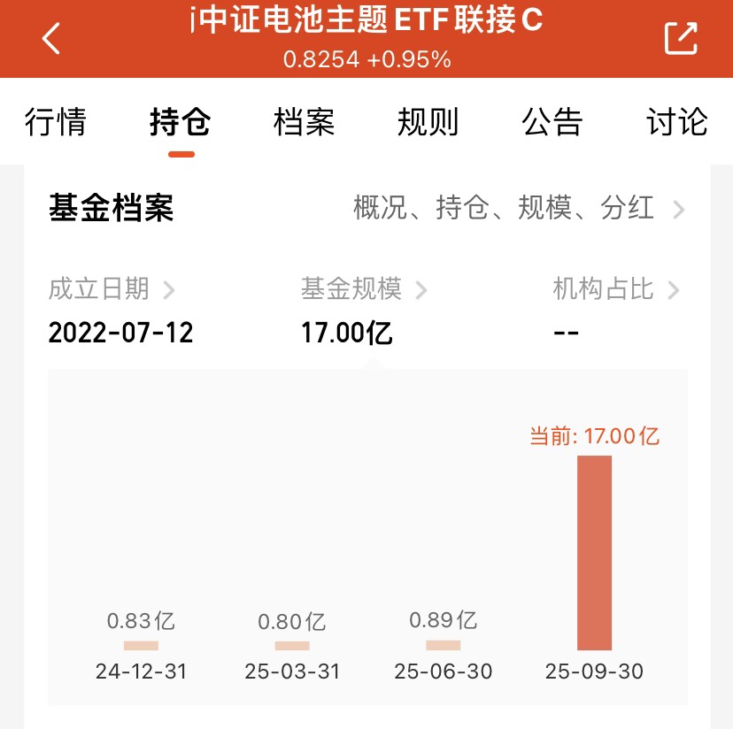今日电池与固态电池板块强势反弹,新能源行情亮眼。从一年维度看,锂电板块估值不算高,行业明年预计能保持 25%-30% 的增长,仍有向上空间。固态电池落地加速,还能进一步抬升板块估值。普通投资者想把握机会,$招商中证电池主题ETF联接C(OTCFUND|016020)$一键布局产业核心环节,定投或分批介入,看看基金规模扩张速度,轻松拿捏中长期成长红利。