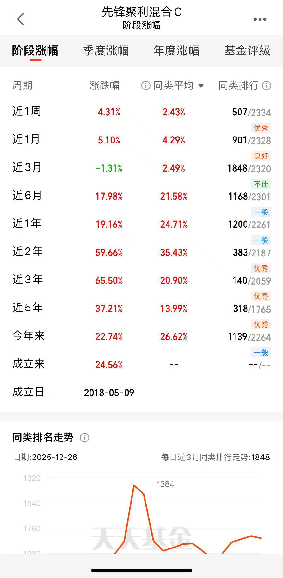 市场切换快但主线不变,先锋聚利C在分化行情中逆势亮眼,行业轮动策略优势凸显,中长期收益有保障,继续持有。