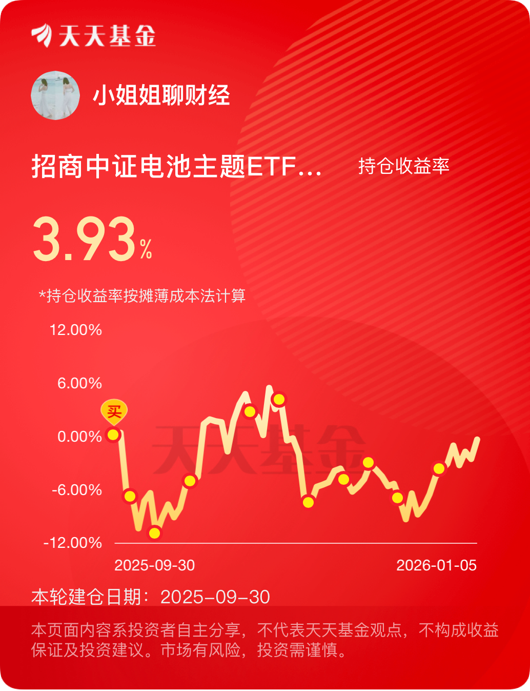 今日加仓1000元招商中证电池主题ETF联接C(016020),这是当前还没有充分上涨的科技细分方向,估值合理,储能需求爆发确定性强,后续补涨潜力十足。目前我定投的份额已经盈利3个点了。