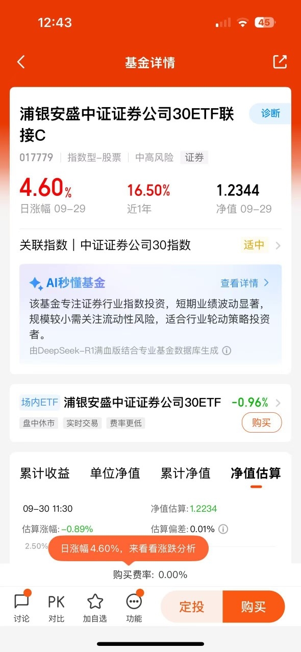 坚定持有继续上车浦银安盛证券30,券商板块是全市场不多的业绩好估值低的板块,拿住不会失望$浦银安盛中证证券公司30ETF联接C$