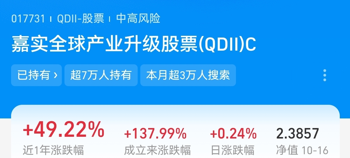 今天三大指数集体调整了,不过美股我看晚上要企稳了,那么降息预期升温叠加AI产业爆发,科技赛道成焦点。$嘉实全球产业升级股票(QDII)C$ 布局英伟达、美光等产业链企业,过去两年灵活切换美股半导体与港股标的,今天逆势上涨更新0.24%,在科技向上周期中,有望持续上涨。