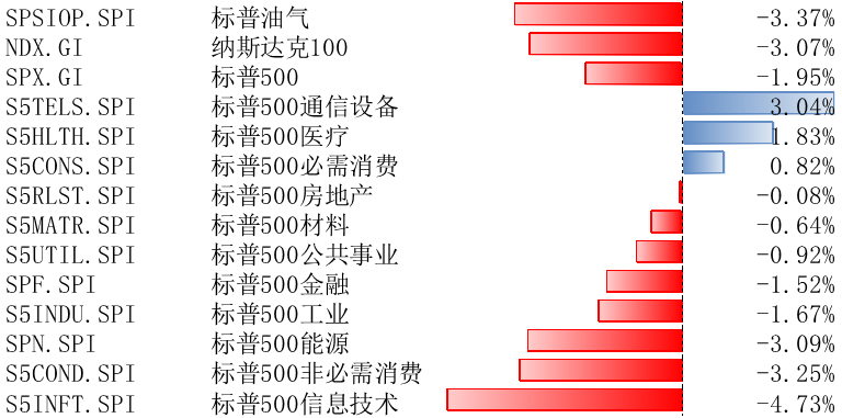 上周(11月17日-21日),标普油气指数整周下跌3.37%,纳斯达克100指数整周下跌3.07%,标普500指数整周下跌1.95%,其覆盖的11个行业板块有3个上涨,其中标普500通信设备领涨3.04%,标普500信息技术领跌4.73%。