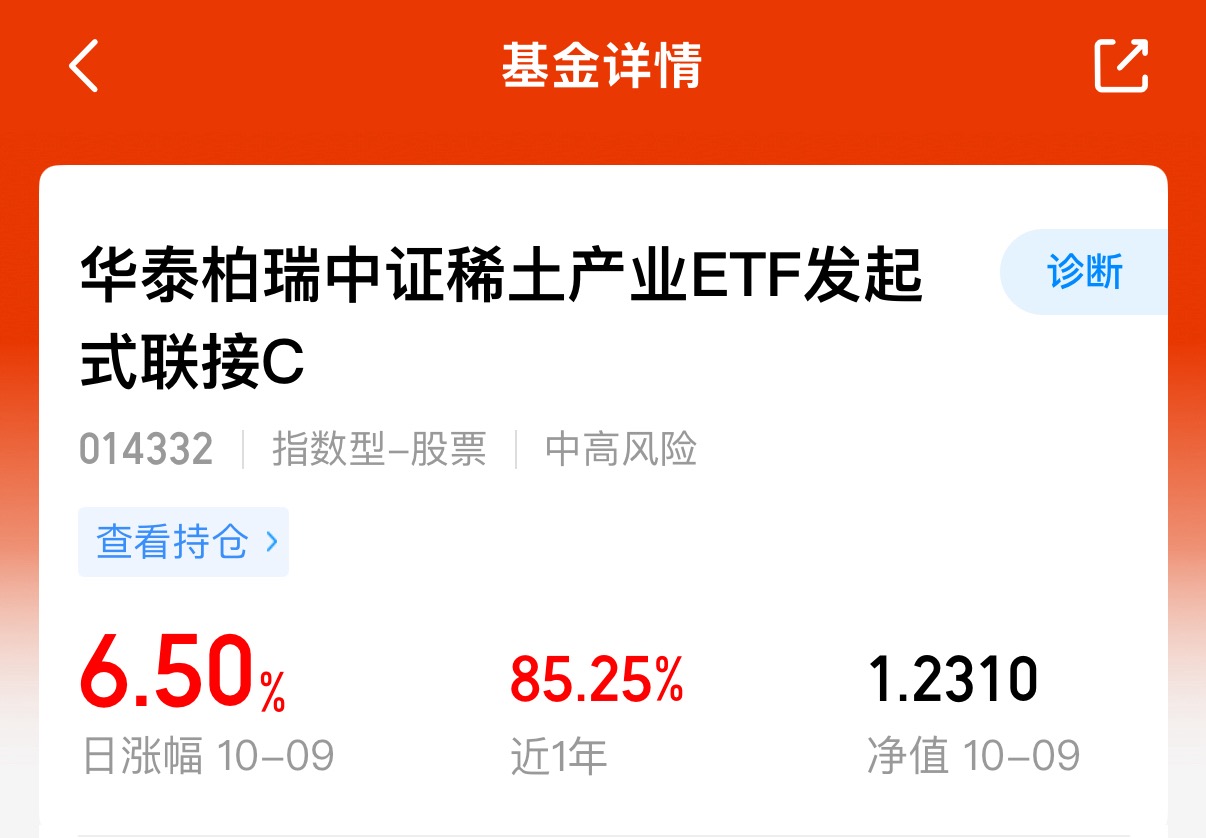 $华泰柏瑞中证稀土产业ETF发起式联接C$ 今天又大涨6.5%,近一年涨幅85.25%!中国稀土产业优势明显,这些龙头企业长期价值凸显。#国际金价史上首次升破4000美元大关# #沪指盘中突破3900点!什么信号?# #10月你看好哪些投资赛道?#