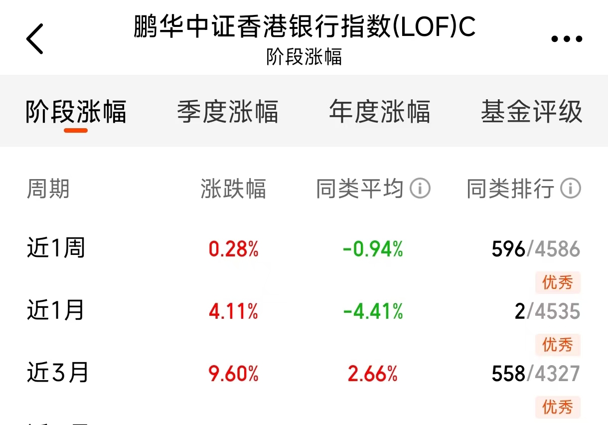 我又买了点$鹏华香港银行指数(LOF)C$(010365)。作为被动指数基金,它的优势在于规则化运作,严格跟着指数,近一月净值增长接近4%,在近期市场中表现不错。投资这类基金,本质上是看好港股银行板块的整体发展和价值回归潜力,这是一种比较省心省力的参与方式。#3800点的A股值得加仓吗?#