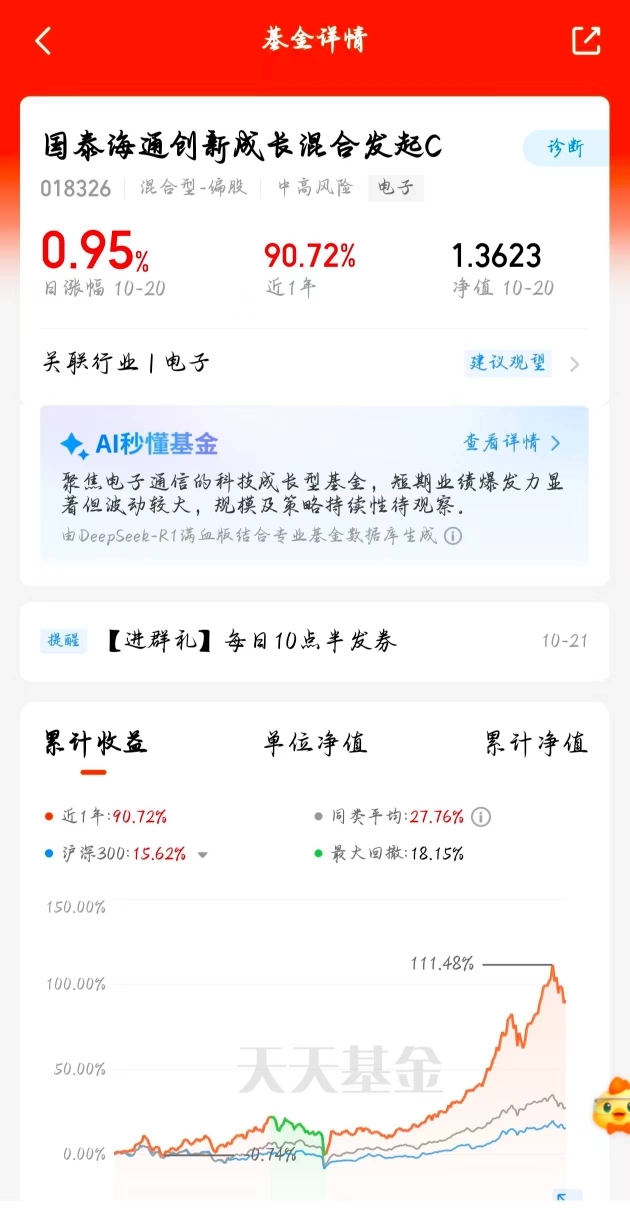这只算力基表现真不错,昨天又涨了0.95%。今年收益已经翻倍,最大回撤才18%,拿着真的很省心,适合长期持有。