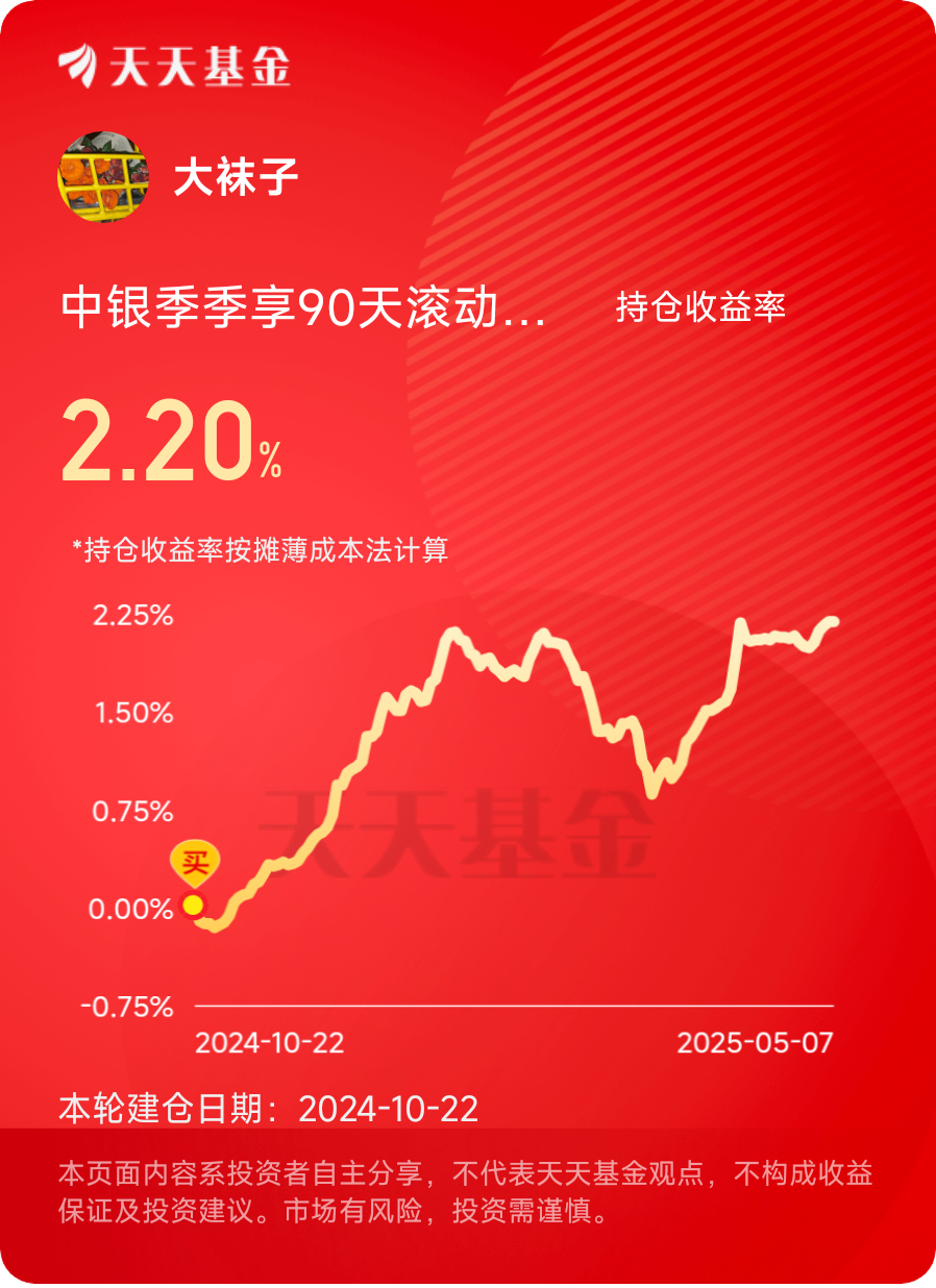 昨天这行情不丢蛋就是莫大的安慰,今天债市强势翻红~期待一下$中银季季享90天滚动持有中短债债券发起C$ #晒收益#