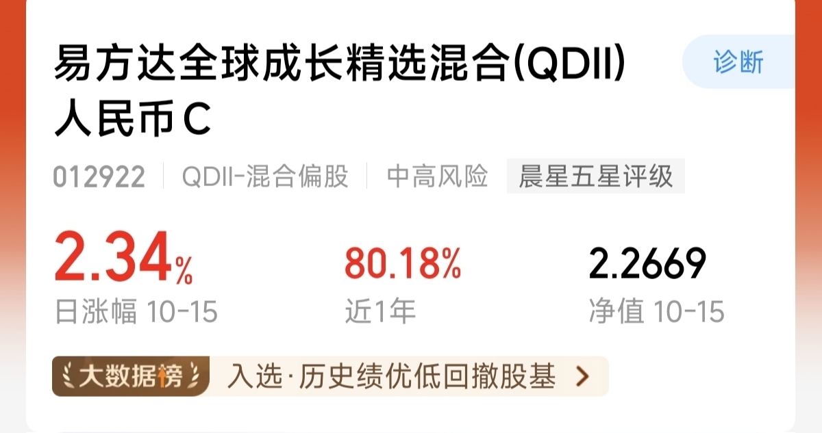 今天这行情太难了。目前来看还是要均衡配置。$易方达全球成长精选混合(QDII)人民币C$ 这只聚焦全球科技的主动混合基金。是可以投a股,港股,美股,多地的科技基金。不但能够把握多利机会,还可以避免单一市场波动风险,而且持仓整体均衡。昨天上涨了2.34%。,近一年涨幅80.1%。长期表现做到了涨多跌少。随着美联储降息,全球科技有望继续受益。我坚定看好未来的成长表现。