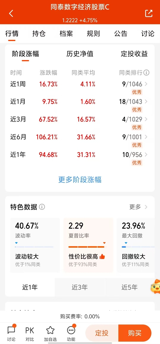 同泰数字经济C太牛啦!在众多基金中排名前百分之1,是科技型基金的佼佼者。近一年收