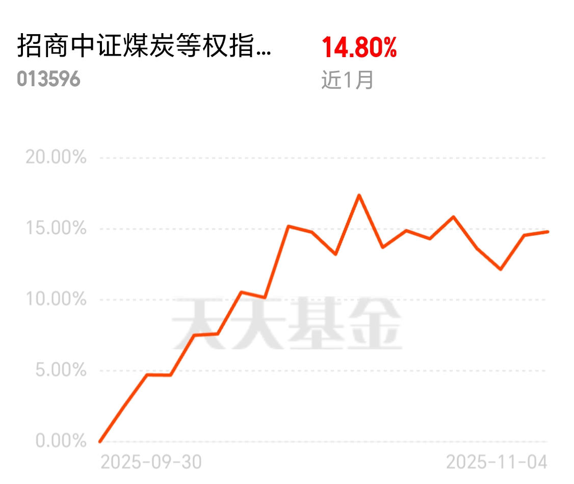 开盘半小时,煤炭板块的涨幅一直在扩大,热度很高,资金持续进场。招商中证煤炭等权指数C近1个月14.98%,在这波里表现很好。