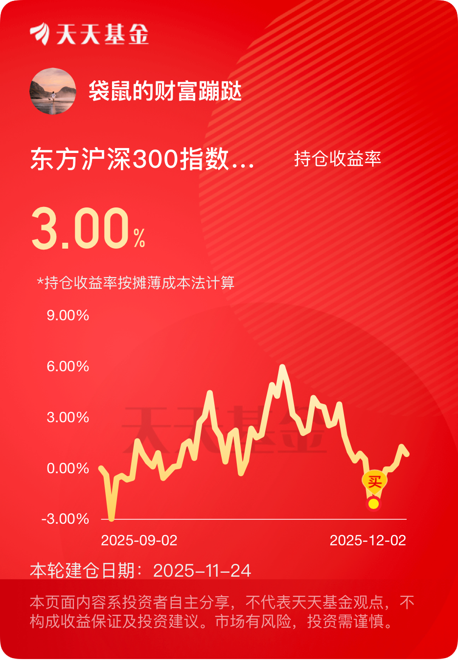 沪深300走得稳才走得远,短期没暴起但核心资产撑着稳健收益,长期肯定能打,拿着是真省心~