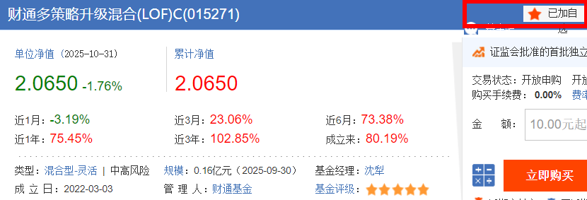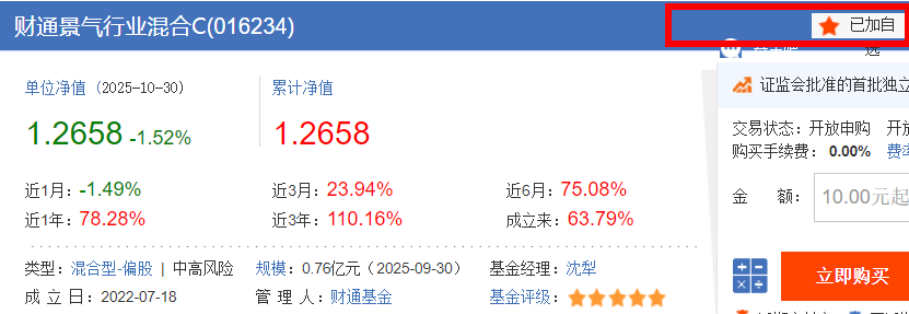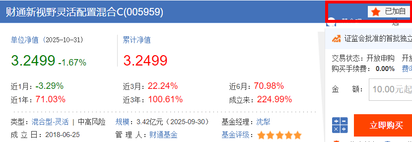 截至 10 月 30 日,这只基金最新净值 3.5049 元,近 1 年收益 74.90%,不仅远超灵活配置型基金平均 41.2% 的收益,还跑赢了易方达均衡成长 A(58.3%)、汇添富均衡优选 A(62.7%)等同类竞品。