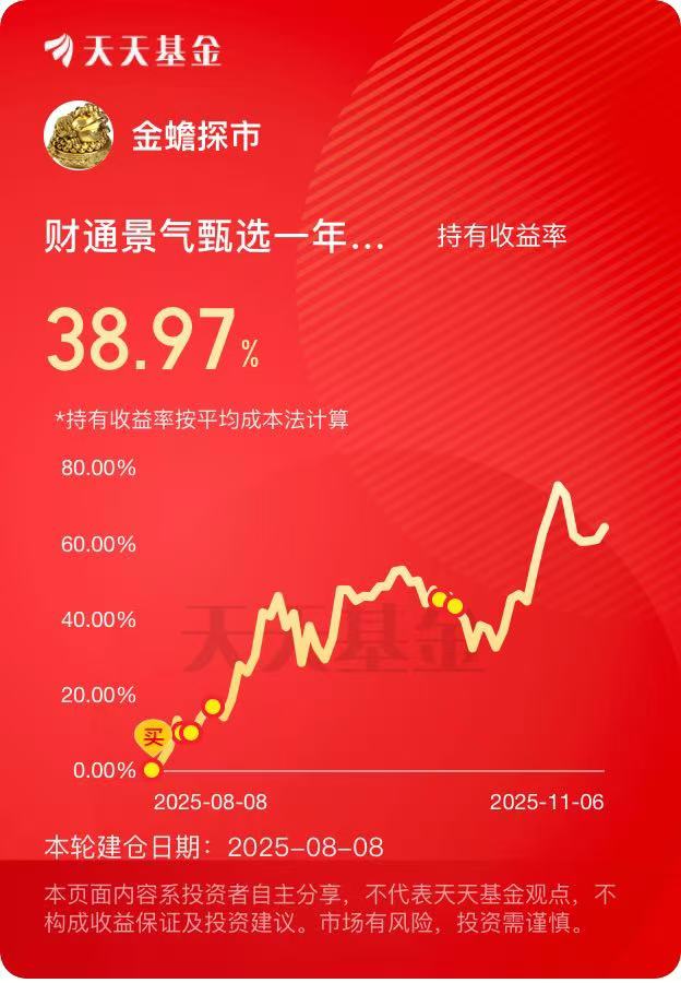 #如何在市场中寻找风险与收益的平衡点##晒收益#$财通景气行业混合C(OTCFUND|016234)$投资基金的这几年,最深刻的感受不是赚了多少,而是终于不用在市场涨跌里慌慌张张。就像我持有的$财通景气甄选一年持有期混合A(OTCFUND|017490)$,现在收益率 38.97%,不算特别惊艳,但每一步都走得踏实。其实找到风险与收益的平衡点不难,关键是摸透自己、选对标的,再给自己留好缓冲,那个 “不慌不忙” 的支点自然就出现了。